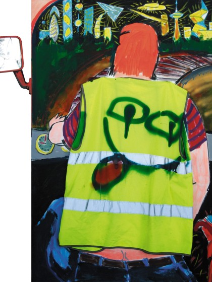 2014. Холст, акрил, масло, фломастеры, жилетка работника дорожной службы, боковое зеркало от «Фольксваген Транспортер» 1983 г.. 90х125 см.